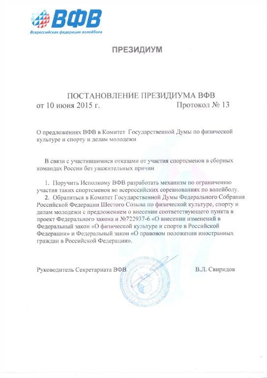 Следующий закон, который упоминается во втором пункте постановления -  «О правовом положении иностранных граждан в Российской Федерации». К сборной России и «отказникам», он какое отношение имеет? Как эти две выписки связаны между собой? Неужели решить проблему «участившихся отказов от участия спортсменов в сборных командах России», можно лишив права выезда за границу путем ограничения выдачи трансферов и ограничения участия во всероссийских соревнованиях, то есть предложения по узаконению Госдумой дисквалификации игрока, естественно в соответствии с перечнем уважительности причин отказа? Иностранцам их права не урезать на уровне Федерального закона, не тот закон, и не те это люди. Их участие можно ограничить лишь в Чемпионате России, ужесточив существующий лимит. Есть множество международных соглашений являющихся первостепенными в правовом государстве. В футболе яркий пример обоюдовыгодного сотрудничества предприимчивых иностранцев и не прогрессирующих российских игроков, доведенный до абсурда. Ни один российский игрок не нужен зарубежным клубам за ту цену, которую им предлагают в России. Игроки с удовольствием и безотказно едут играть за сборную страны, показывая результаты, известные любому. Ограничивая права игроков в волейболе, мы рискуем впустую тратить средства, не гарантируя никакого результата и прогресса. Потребителей этих средств во все времена найдется предостаточно.