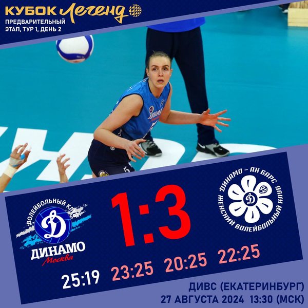 The volleyball players of Dinamo Moscow lost to Dinamo-Ak Bars Kazan with a score 1:3 (25:19, 23:25, 20:25, 22:25) in the second match of the group stage of the Cup of Legends in Yekaterinburg.