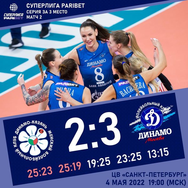 Dinamo volleyball players beat Dinamo-Ak Bars Kazan in the second guest match of the series for the third place of the Russian Championship – 3-2 (23:25, 19:25, 25:19, 25:23, 15:13). The score in the series to three wins was 2-0 in favor of the capital team. The series is moving to Moscow.