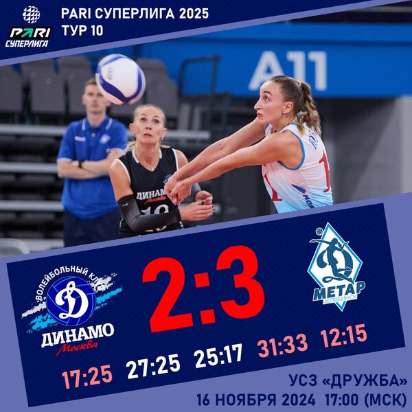 The volleyball players of Dinamo Moscow lost to Dinamo-Metar Chelyabinsk with a score 2:3 (17:25, 27:25, 25:17, 31:33, 12:15) in the home match of the 10th round of the PARI Super League.