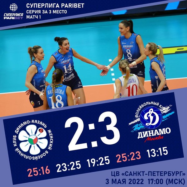 Dinamo Moscow started a series for the bronze medals of the Russian Championship against Dinamo-Ak Bars Kazan with a victory" - 3-2 (16:25, 25:23, 25:19, 23:25, 15:13).